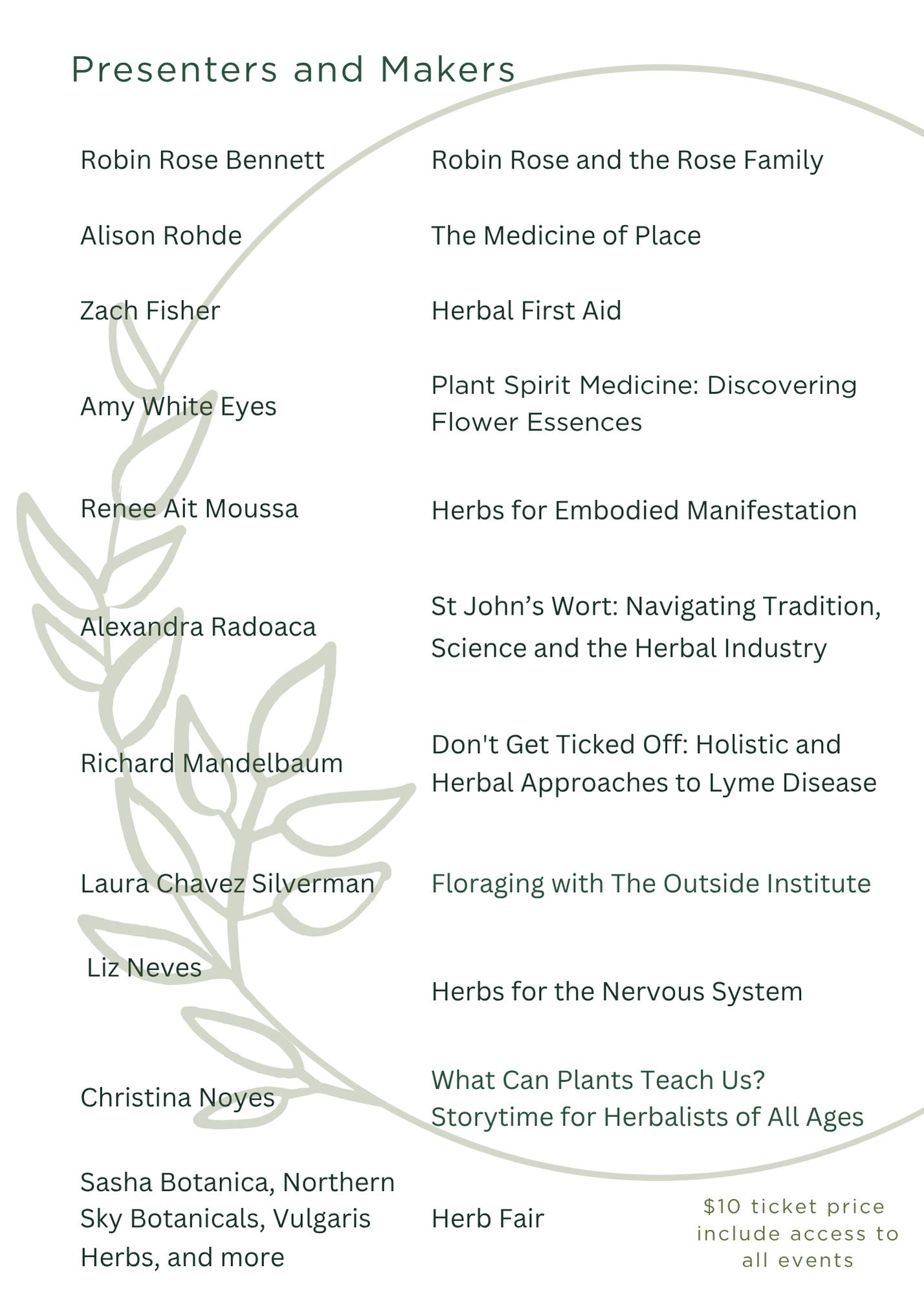 Ticket price includes access to all events. Products and supplies available during the herb fair are pay-what-you-can. Delicious lunch and snacks provided by AOOA are available for purchase.